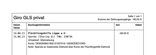 Die Spende musste über die Flüchtlingshilfe Detmold abgewickelt werden, die das Geld an die Seebrücke Detmold weitergibt; die Seebrücke-Ortsgruppe Detmold hat kein eigenes Spendenkonto.